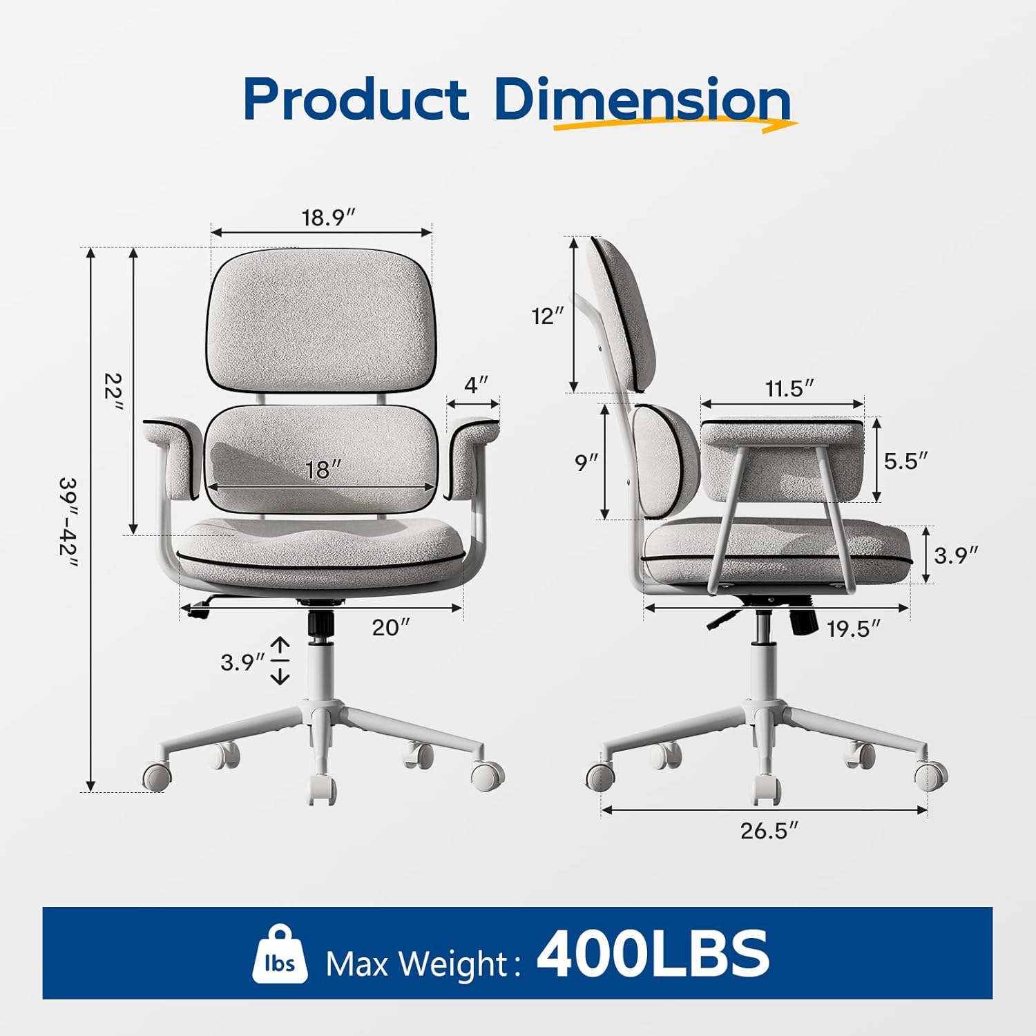 Sturdy Metal Frame with 400LBS Weight Capacity: Our Comfy desk chair features a robust frame constructed from high-quality materials, engineered to support up to 400 pounds, ensuring lasting durability and reliable stability for your daily work needs